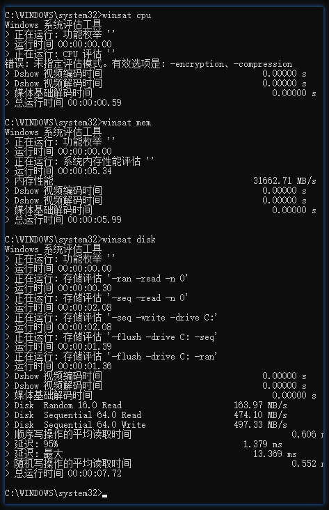 # 随机读winsat disk -ran -read -n 0# 随机写winsat disk -seq -read -n 0# 测延迟 ,对 C 盘winsat disk -flush -drive C: -seqwinsat disk -flush -drive C: -ran