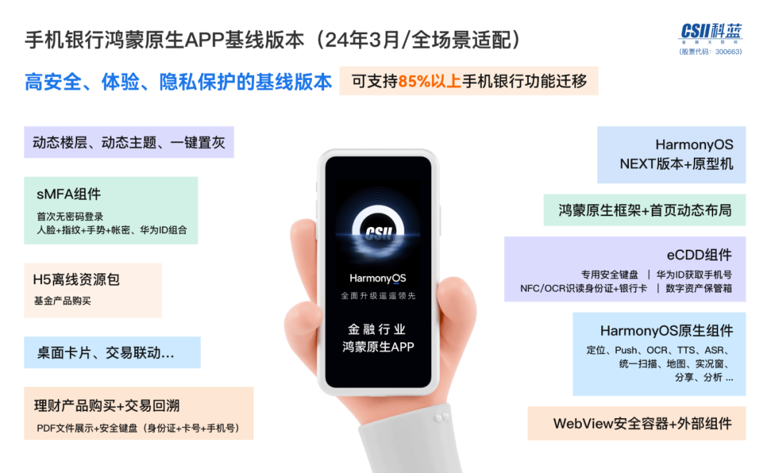 其次,该基线版本引入HarmonyOS TEE可信计算环境,对移动金融APP进行了全面安全升级。全面提升应用安全、通讯安全、输入安全、环境安全和隐私保护能力,有效保护客户资金安全和个人金融敏感数据。