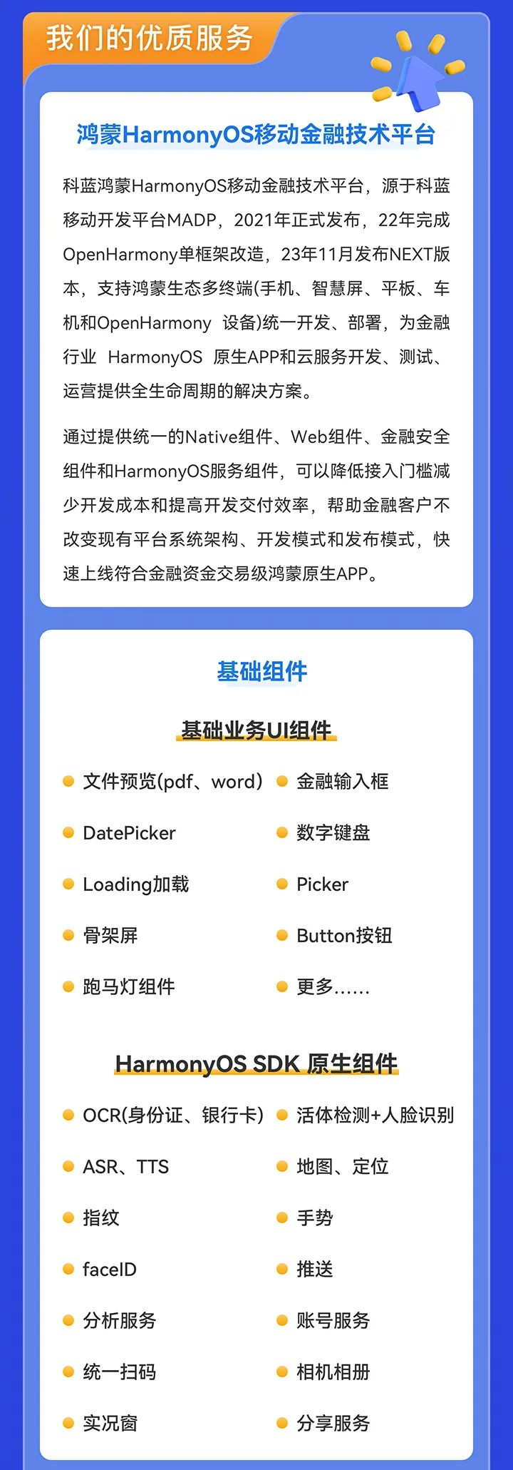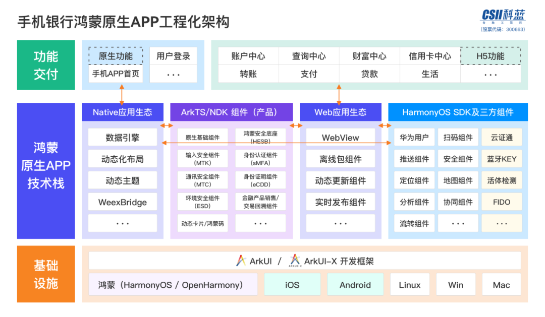 科蓝鸿蒙HarmonyOS NEXT版原生APP金融行业基线版本,基于科蓝自研MADP平台、金融业务UI组件包、移动金融原生常用功能组成,整合超过15类华为HarmonyOS SDK 原生组件或API能力。提供完整示例的种子工程,包含动态化楼层,组件示例和交互示例。基线版本内嵌20+的原生金融业务组件、首页动态化布局、动态楼层、动态主题以及完整金融业务全流程功能示范,支持交付团队快速开发原生功能和迁移存量H5前端功能,降低接入鸿蒙门槛,减少交付开发成本和提高开发交付效率。