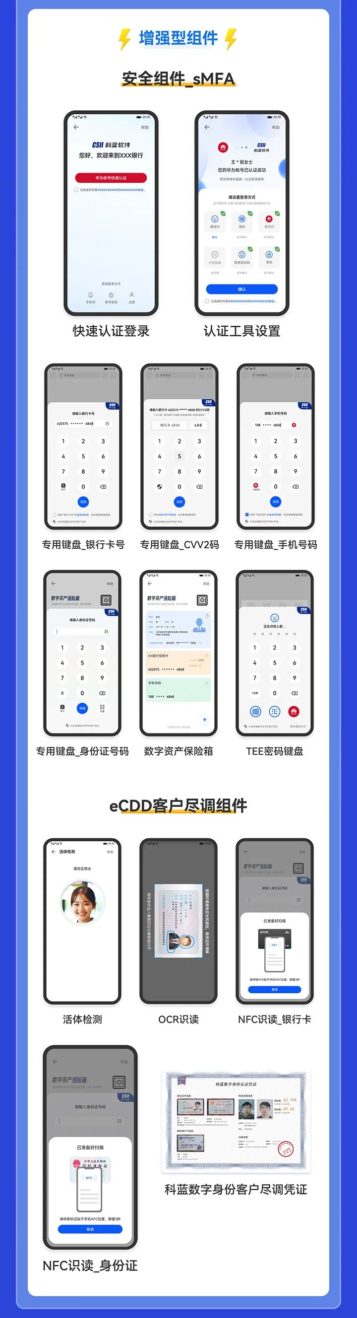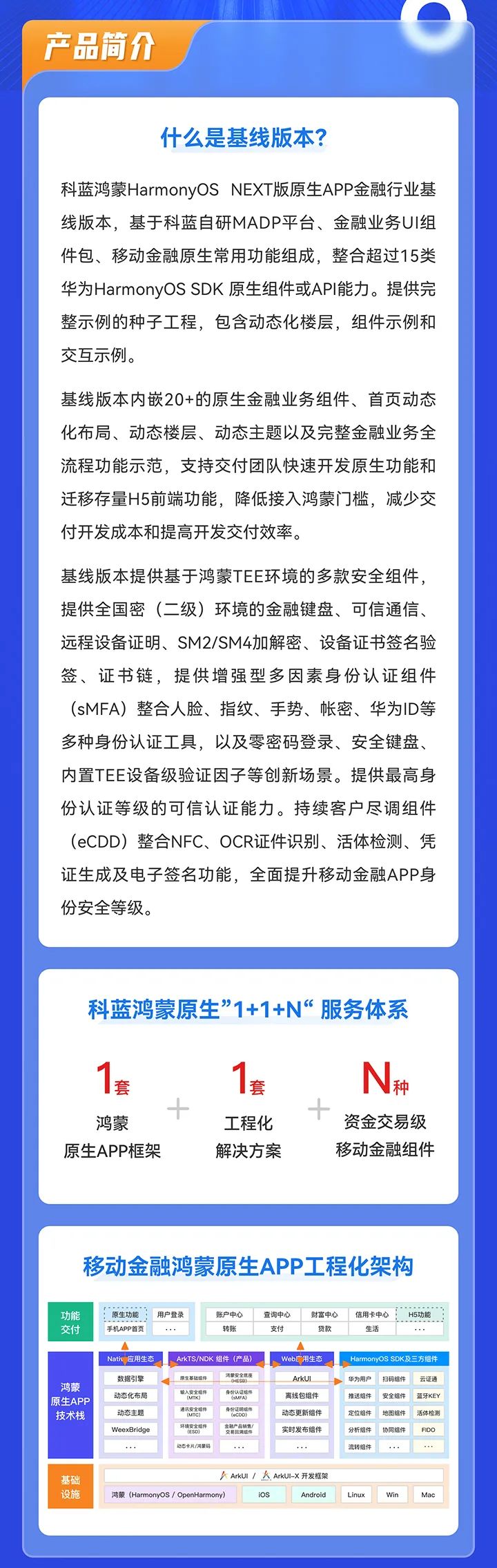 基线版本提供基于鸿蒙TEE环境的多款安全组件提供全国密(二级)环境的金融键盘、可信通信,远程设备证明、SM2/SM4 加解密、设备证书签名验签、证书链,提供增强型多因素身份认证(sMFA)组件整合人脸、指纹、手势、帐密、华为ID等多种身份认证工具,以及零密码登录、安全键盘、内置TEE设备级验证因子等创新场景。提供最高身份认证等级的可信认证能力。持续客户尽调组件(eCDD)整合NFC、OCR证件识别、活体检测、凭证生成及电子签名功能,全面提升移动金融APP身份安全等级。