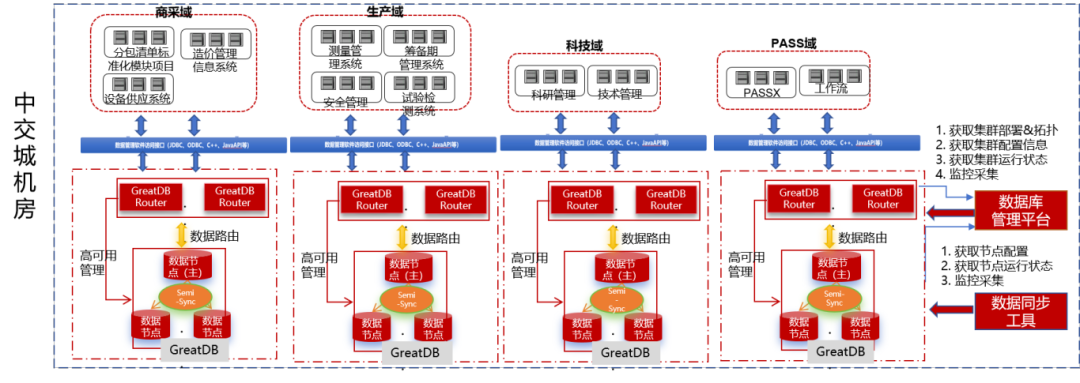 根据中交二航局目前系统整体架构和业务系统情况,按域分为生产域、科技域、商务域、采购域、PASS及后期的经营域、监督域和合同域。以下为万里数据库解决方案: