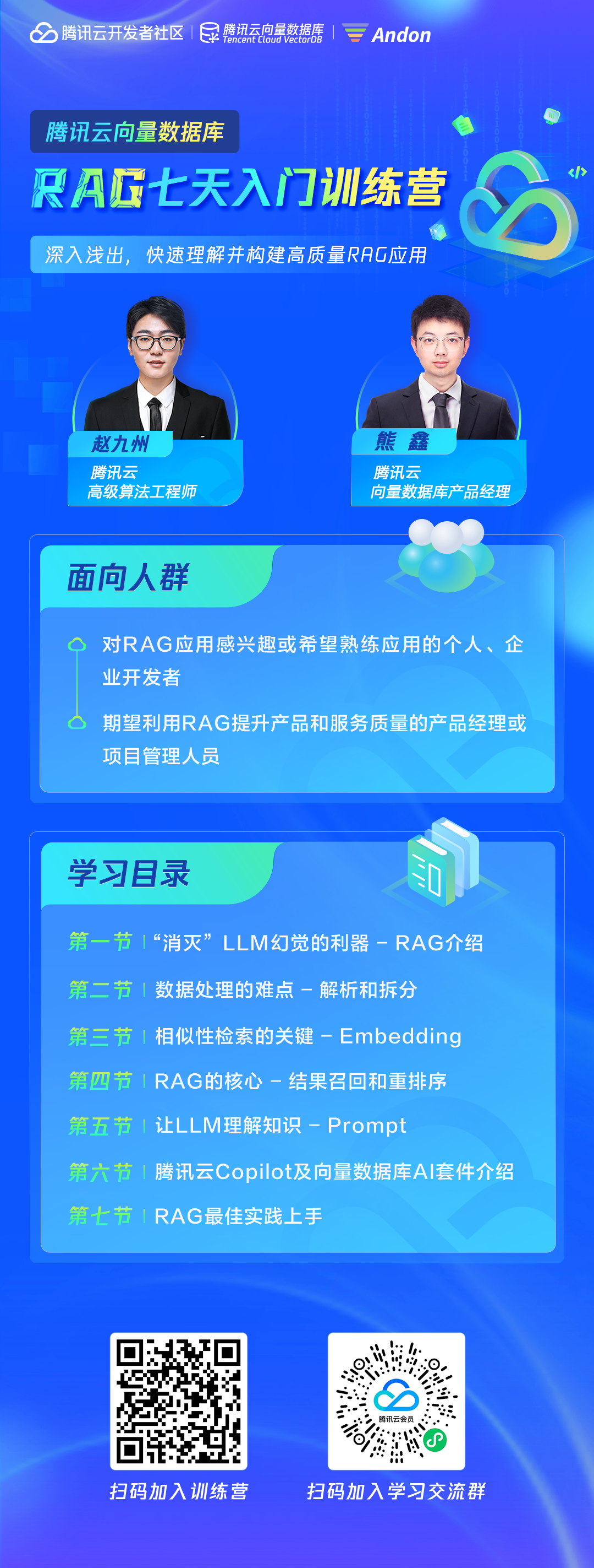 为帮助各位开发者快速融入AGI时代的浪潮,腾讯云向量数据库团队联合腾讯云安灯团队打造《RAG 7 天入门训练营》课程,该课程将揭秘大模型和向量数据库的最佳搭档方式,拆解RAG应用构建中每个环节的技术细节,并分享安灯团队Copilot智能问答应用落地生产的优化手段,助力各位开发者快速构建高质量RAG应用。