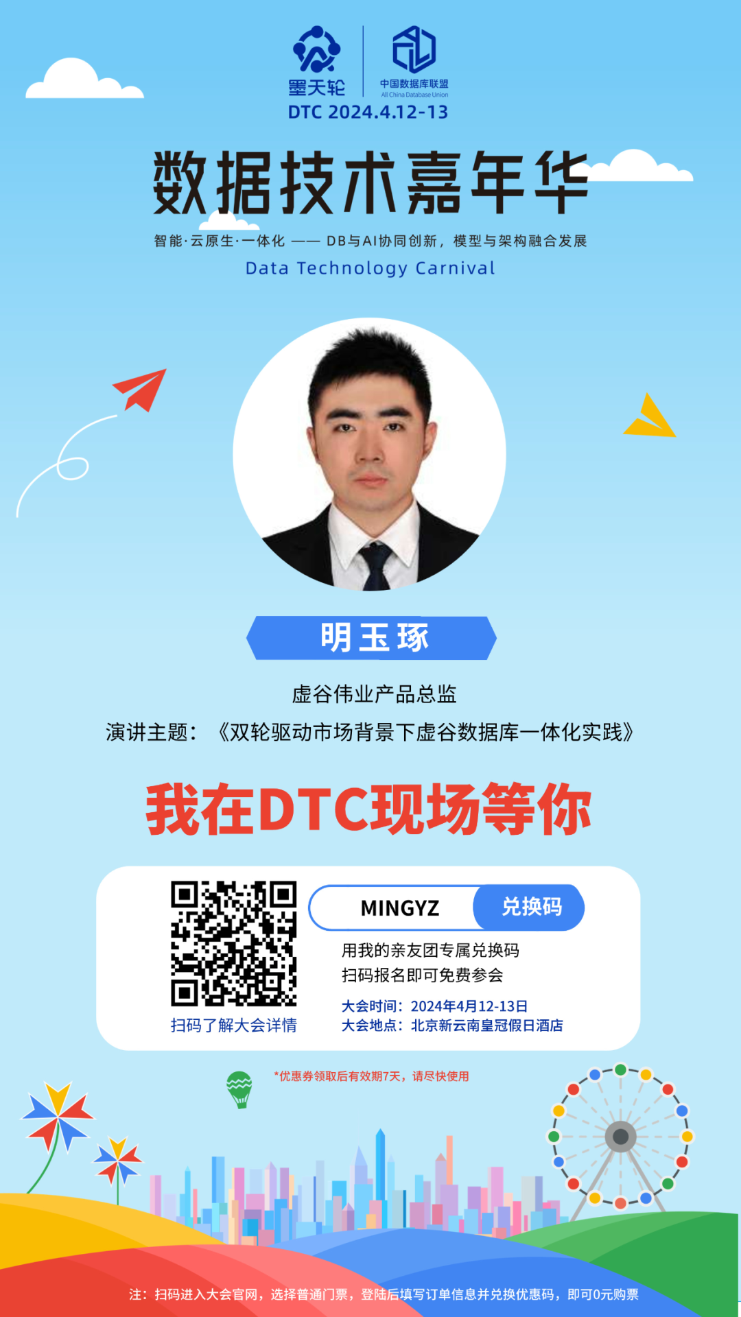 DTC2024,虚谷数据库,期待与您共同见证数据技术的未来之路!0元购票福利:👉进入数据技术嘉年华官网 ( https://www.modb.pro/dtc2024 ),购票时使用虚谷伟业专属优惠码【MINGYZ】即可免费购买普通门票一张,数量有限,先到先得!