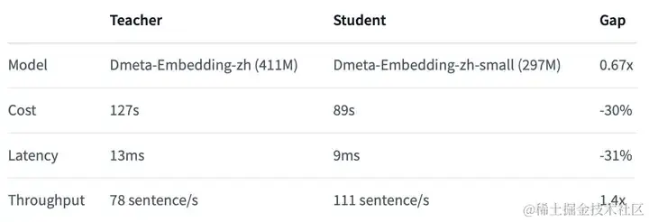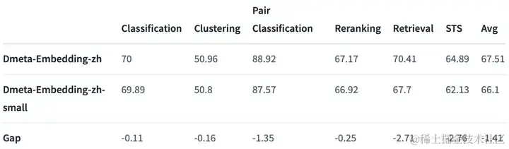 自Dmeta-Embedding-zh发布以来,我们的模型受到了众多用户使用与支持,我们深感荣幸!现在,更轻、更快、更便捷的Dmeta-Embedding-zh轻量化版本Dmeta-Embedding-zh-small已上线!相较于原始版本的Dmeta-Embedding-zh,轻量化的small版本推理速度提升约30% ,模型大小减小约三分之一,总体精度约下降1.4%(参考自MTEB榜单)。