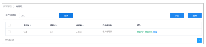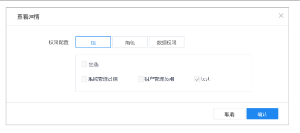 查看对应角色权限 | 在用户组所在行,单击查看权限,弹出查看权限窗口。 |