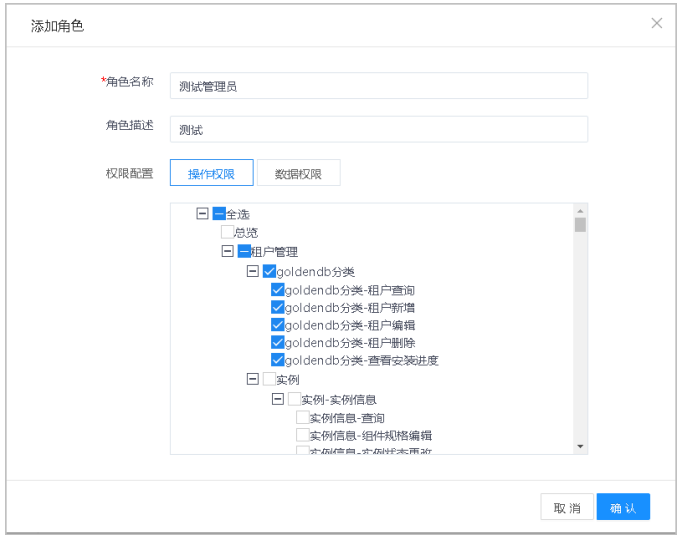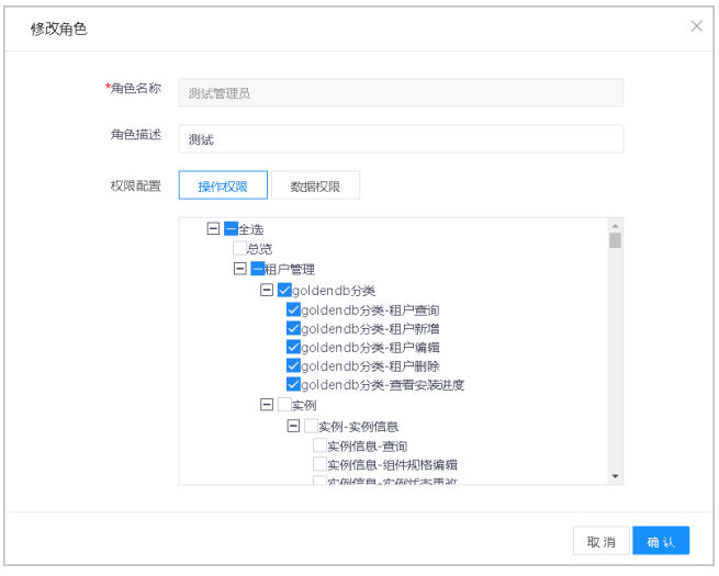 5.修改角色参数(可编辑对象包括:角色描述、操作权限、数据权限),单击确认按钮。
