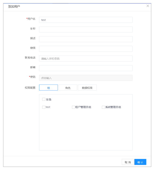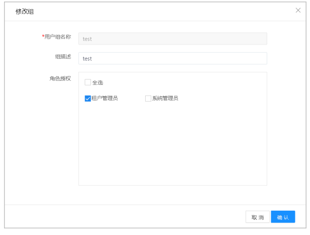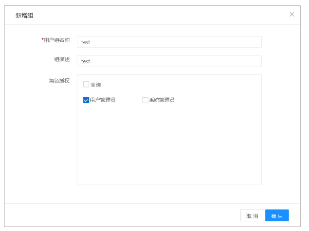 3.填写用户组名称(组名称不能包含特殊字符),勾选角色(组的操作权限为所勾角色权限的并集)。