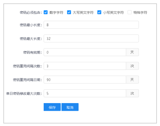 1.选择菜单[权限管理→安全策略→密码策略],进入密码策略管理界面。