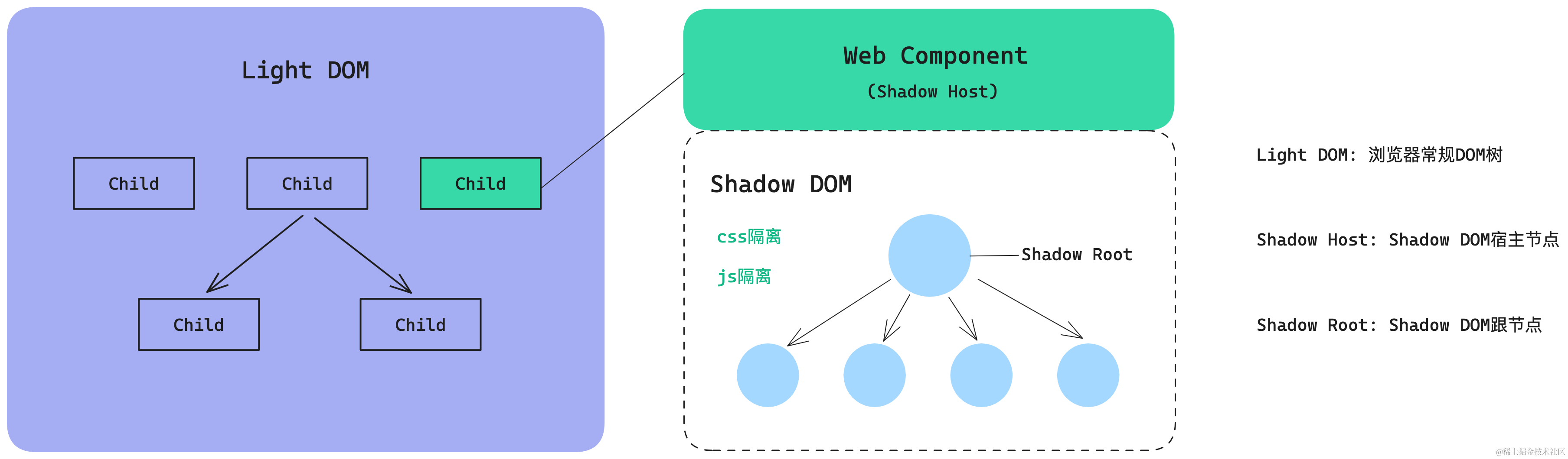 •样式隔离问题:虽然样式隔离有助于避免全局样式污染的问题,但在某些场景下,如主题颜色等,仍需要将样式同步到Web Components组件内部。目前可以通过CSS变量实现主题切换。此外,需要注意的是,slot插槽中的DOM元素样式并未得到隔离。