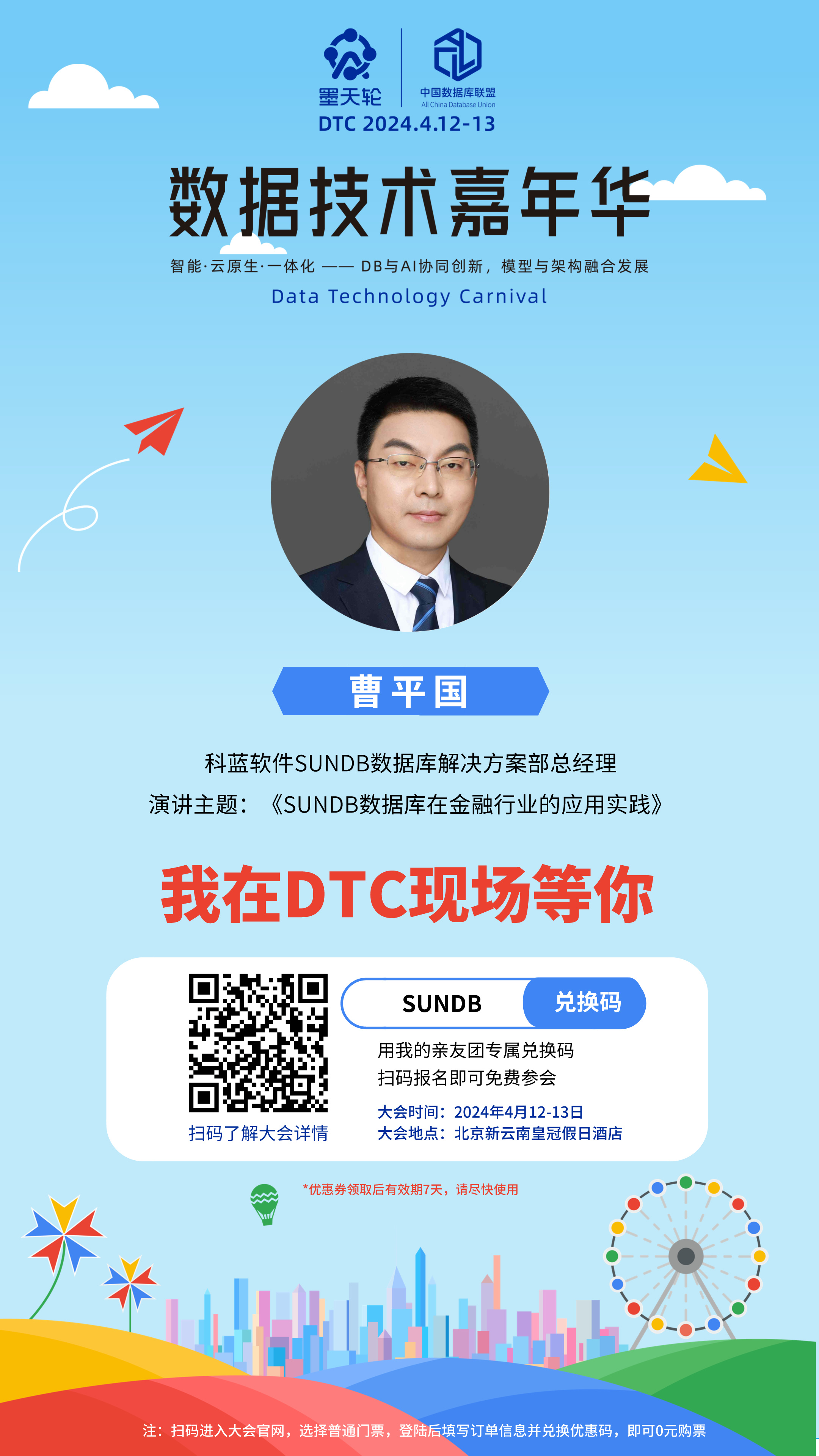 0元购票福利:👉进入数据技术嘉年华官网 ( https://www.modb.pro/dtc2024 ),购票时使用专属优惠码【SUNDB】即可免费购买普通门票一张,数量有限,先到先得!