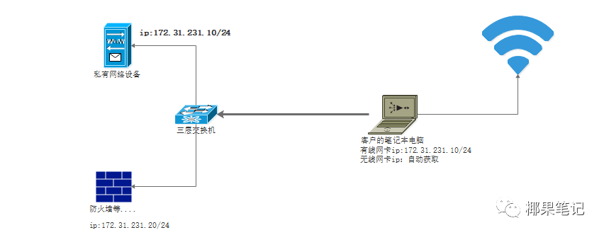 PS:上图中,三层交换机配置了所有网段的路由信息,正常情况下,PC配置了对应的ip地址以及网关后,即可与下端所有网段进行正常通信,如果连接上无线网,pc就不能与下端的设备通信了。