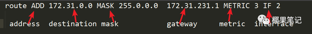 参数含义:address destination mask gateway metric interface /* 能够缩写 */