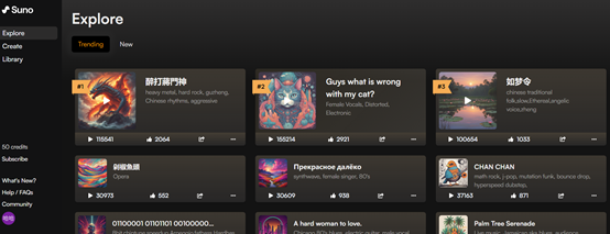 步骤 2 在 Suno 主页中的 Explore,有一个 AI 生成歌曲的排行榜,可在线听音乐。