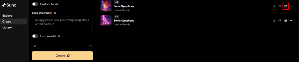 步骤 3 在 Suno 主页中的 Create,在 Song Description 中输入要创作的内容,单击“Create”。单击分享按钮,获取下载链接。