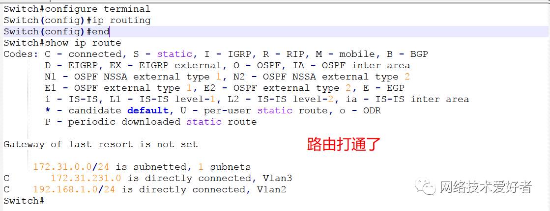 4.打开3层路由;并按照拓扑图将pc连接到交换机端口上,并查看路由信息;