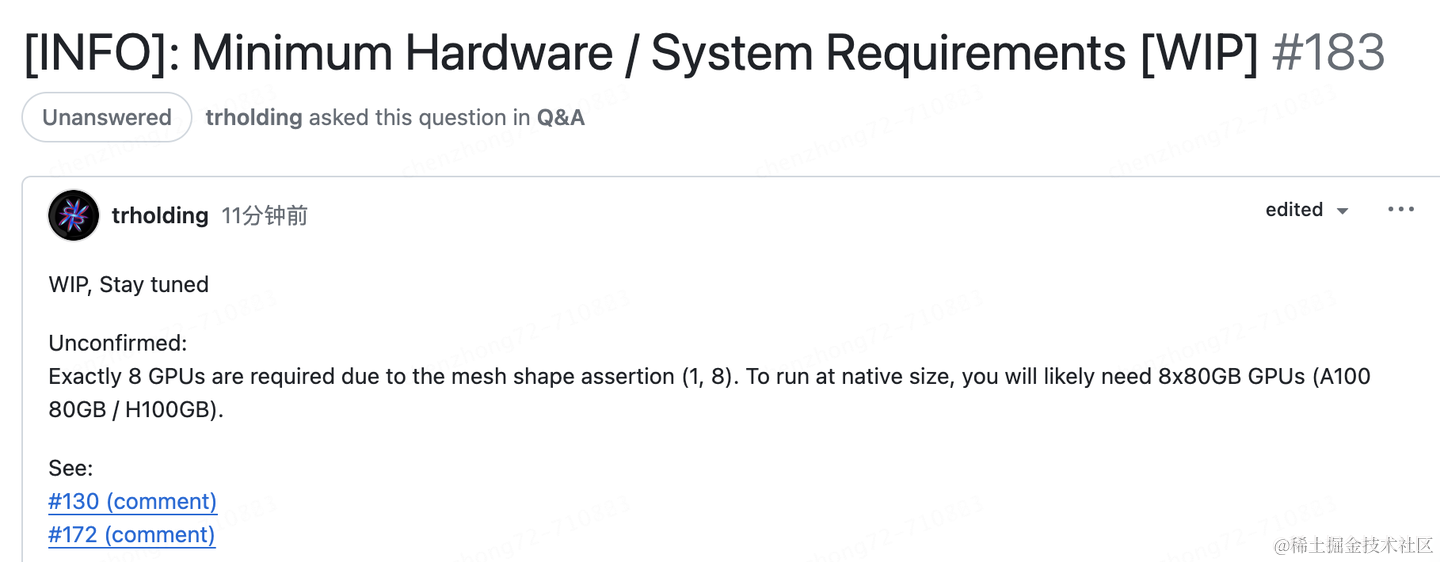 由于由于the mesh shape assertion(1, 8),因此需要 8 个 GPU。要以本机大小运行,您可能需要 8x80GB GPU (A100 80GB / H100GB)。