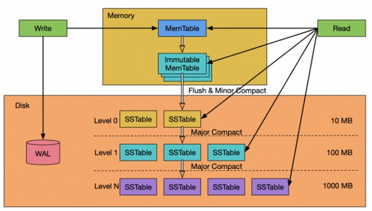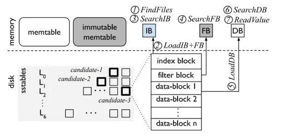 核心思路是将最新的数据驻留在缓存中,等积累到一定量后再使用归并合并的方式将缓存中的数据合并到磁盘队尾中。数据写入时先在内存中组成Mem Table,其内的数据是经过排序的数据,当达成一定程度后将其添加到LSM Tree中,这些相邻的SSTable不保证有序,在后台会启动定时任务进行合并。为了加快数据的读取,大部分的LSM结构中会基于Key的索引和Bloom Filter来快速过滤查询Key,减少IO数据的访问。读取流程如下: