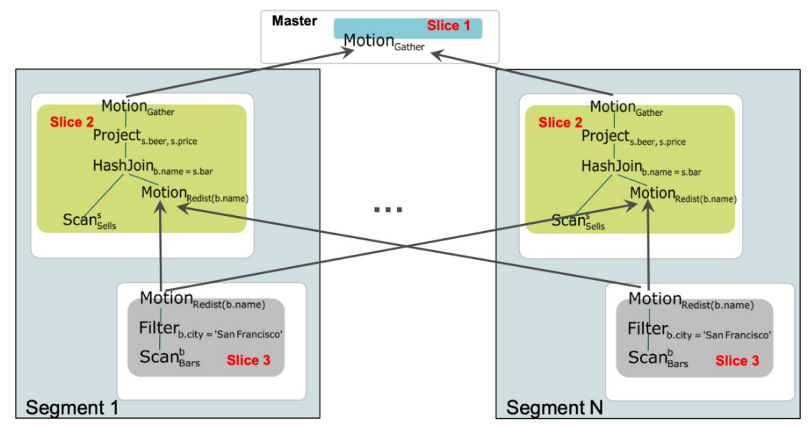 管理节点分布到每个节点的查询计划是相同的,在执行时如果需要每个节点扫描自己所在节点的数据,当需要进行数据交换时调用Motion算子发送到其他节点,例如Join计算中符合过滤条件的右表数据,最后在管理节点上通过GatherMotion进行查询结果的汇总。
