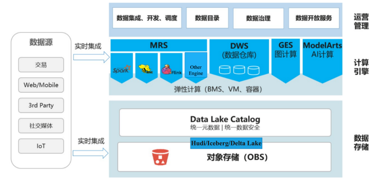 从数据流转和计算来看与大数据数仓基本相同,核心的变化在于使用数据湖存储格式,例如Hudi、Iceberg、Delta Lake等进行数据的组织,解决了数据湖松散的文件结构问题,并在此基础上提供统一的元数据管理能力,实现各种数据库和数据仓库的元数据无缝打通和管理。
