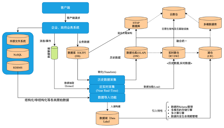 在图中数据库、数据仓库与数据湖保持明确的功能定位,产品体系的界限相对比较清晰,但是随着技术的发展,产品也在相互借鉴融合。数据仓库由于对数据实时性的需求演进到了实时数仓,在这个过程中数据的实时接入框架、查询性能的提升、交互式查询等能力让数仓的实现复杂化;为了面向满足不同数据类型的需求,数据仓库逐步进行数据的融合处理,形成了湖仓、多模数据库的概念。随时云原生技术的发展,目前各种类型的数据仓库在加速向云架构转型,力求打造新一代云数据仓库。目前在业界虽然数仓的产品数量及类型较多,但从技术实现的角度观察,它们正在朝着相似的核心技术和设计理念靠拢例如向量化执行、编译执行、计算Pipeline模型、计算存储分离、灵活弹缩等。
