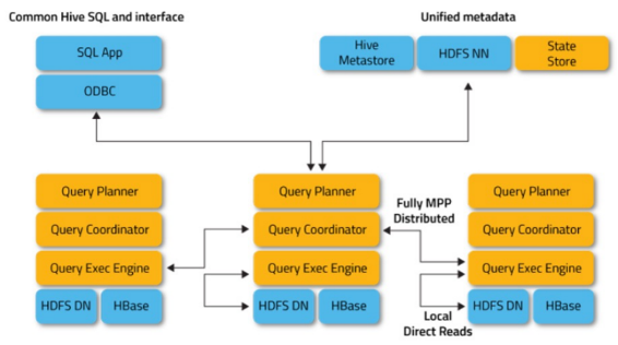 从上面介绍的大数据架构的数仓能力来看为了支持大数据量处理、扩展性和容错性等能力,将不同的组件按照一定的架构“范式”进行叠加,存在架构极其复杂且维护成本很高,采用分布式处理框架查询性能比较低,而且事务支持较弱等问题,因此无法替代传统数仓。但是传统数仓存在集群规模小、并发能力不高、动态扩展性差等问题,因此业界出现了大数据数仓和传统数仓进行互补的新式架构的数仓。在大数据的存储能力基础上使用MPP的架构优势提高计算的实时型,典型数仓产品Impala、Presto/Trino、Hawq等产品,这里以Impala为例,其架构如下图所示: