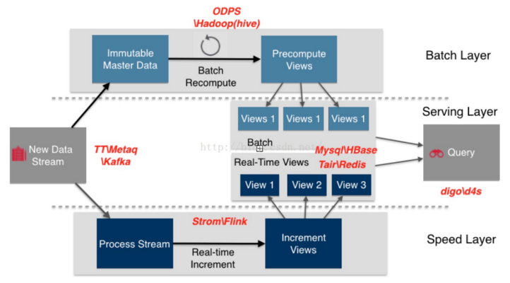 大数据数仓产品并不是某个单独运行的产品,而是一系列大数据组件遵循数据的处理流程的“范式”,例如离线数仓、流式数仓、实时数仓Lambda架构或者实时数仓Kappa架构在大数据组件的使用及数据的流转上是不同的,这里以Lambda为例,架构为例: