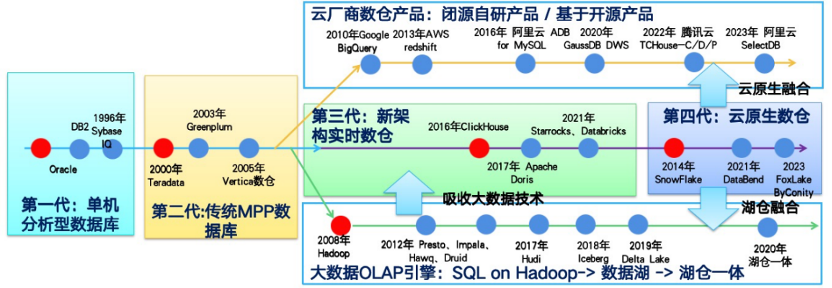 随着计算机科学技术发展与产业变革,数据仓库在应对从数据特征呈现多样化、海量化到业务特征复杂化、智能化及实时化等,再到基础设施(存储、网络及计算资源)能力的提升、云计算技术的发展等变化,数仓的整个体系也在持续演进中,这里从数据仓库的系统架构及内核引擎的实现角度去分析数据仓库的发展过程,基本上如下图所示: