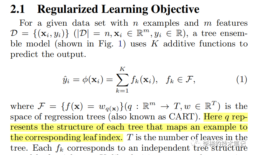 可以看出,相比GBDT,XGBoost在其基础上添加了正则化项,正则化项中的对应第个弱学习器第个叶子节点的最优值,与GBDT损失函数中的是相同的意思(陈天奇的论文中是用表示的,意思一样),指的是叶节点的个数,和都是超参数。在损失函数中添加正则化项的有助于降低模型的复杂性和防止模型出现过拟合的情况。