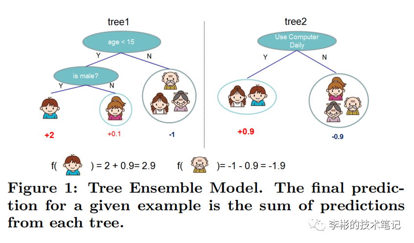 简单解释一下,数据集中的每一条数据都会落入弱学习器叶子结点的某一个区域,即对应的预测值,然后最终的预测结果等于所有树的预测值之和。如下图,小男孩(代表数据集中的一条数据)最终的预测结果为tree1和tree2预测值之和: