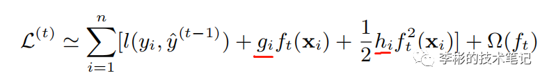 其中和是第i个样本在第t个弱学习器对一阶偏导和二阶偏导,由于损失函数中的是常数,在最小化中可以去掉,上面的式子可以进一步写成: