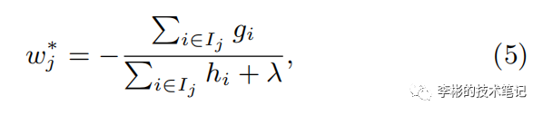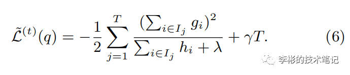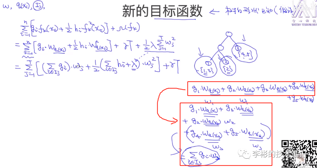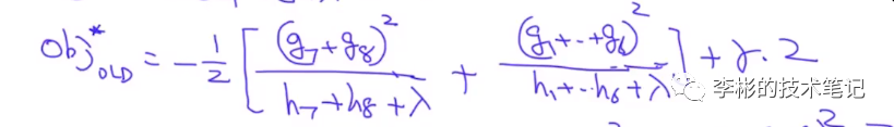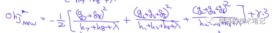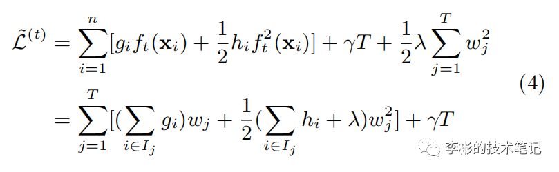 以下是公式(4)的推导改写过程,将n条数据全部代入目标函数后,可以将式子从叶节点的角度改写一下