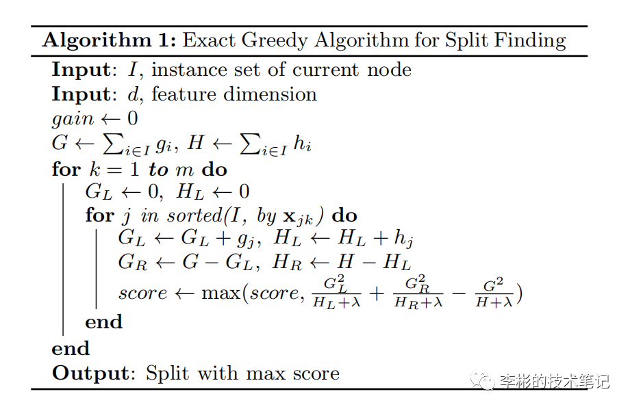 计算所有m个样本对于当前轮损失函数的一阶导数和二阶导数 基于当前节点分裂决策树,初始化score为0,如果当前有个特征: 样本按照第k个特征排好序,放入左子树,然后计算左右子树一阶和二阶导数和 更新score 基于score最大的特征分裂