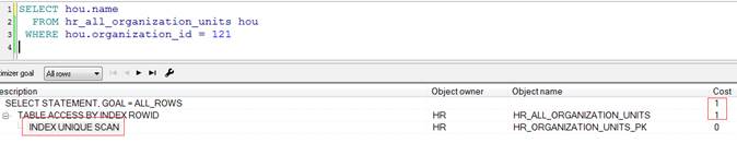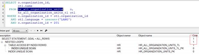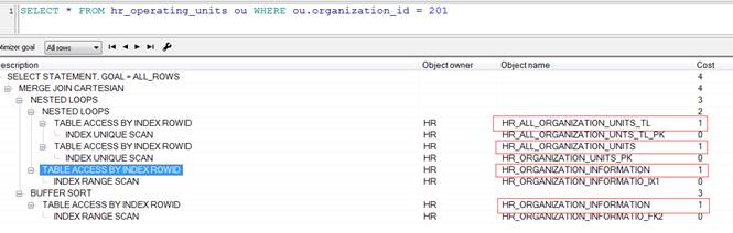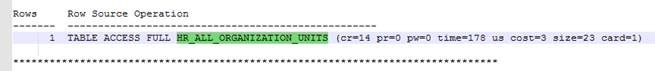 如下图:SQL中查询表:HR_ALL_ORGANIZATION_UNITS,在这里使用了全表扫描,如果实在很大SQL中,肯定会影响执行效率,所以我们对于全表扫描的的SQL,要进行优化。