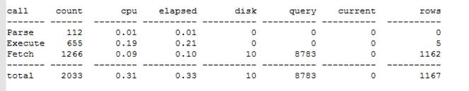 F、cpu Or elapsed 太大表示执行时间过长,或消耗了了大量的CPU时间,应该考虑优化