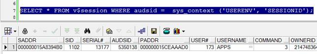 WHERE audsid = SYS_CONTEXT ('USERENV', 'SESSIONID');