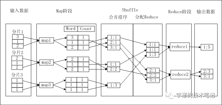 以统计一段文本的词频为例,介绍MapReduce的过程: