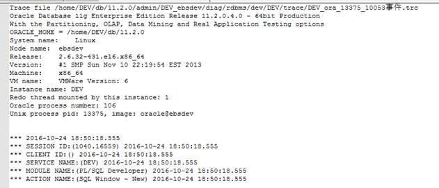 1、第一部分,文件顶端的信息,是TRACE文件的通用信息,包含了操作系统、数据库、会话信息。