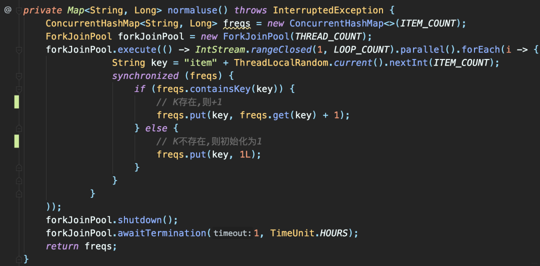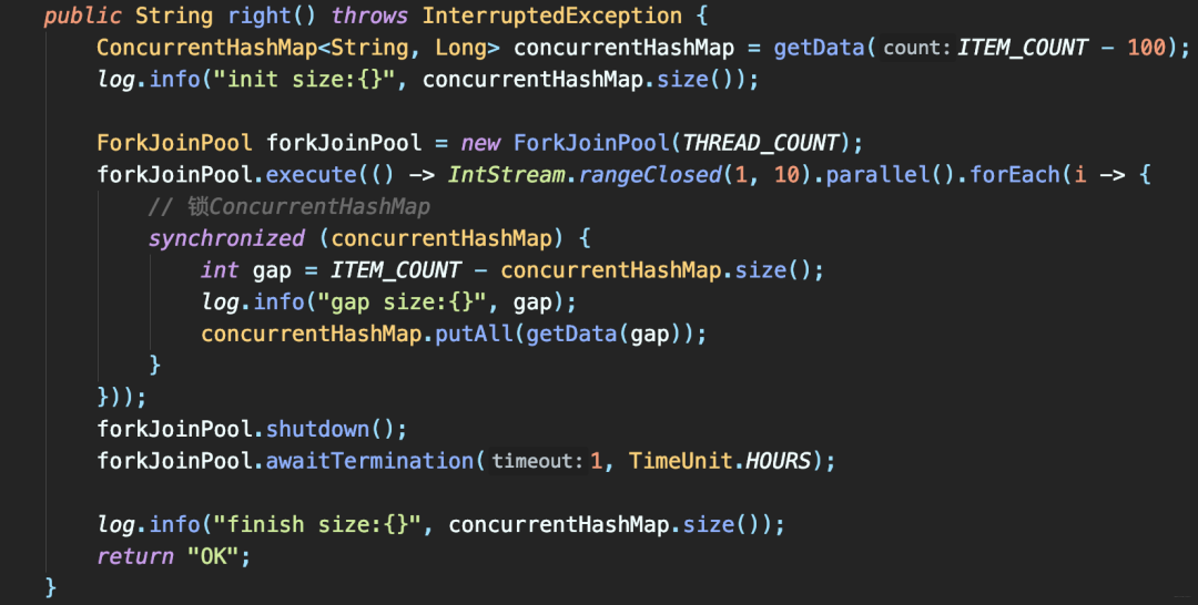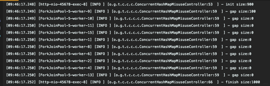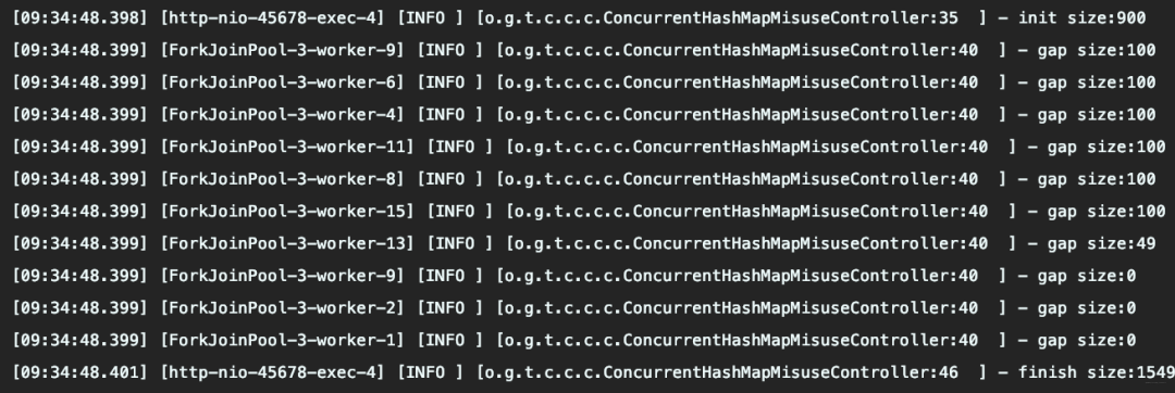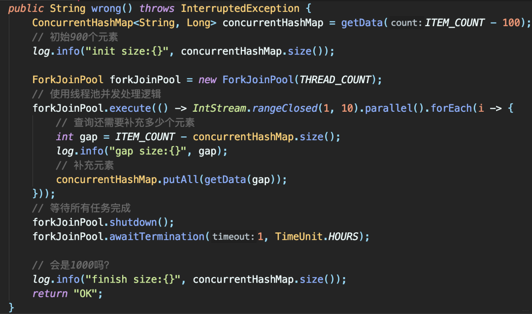 开发人员误以为使用ConcurrentHashMap就不会有线程安全问题,于是不加思索地写出了下面的代码:在每一个线程的代码逻辑中先通过size方法拿到当前元素数量,计算ConcurrentHashMap目前还需要补充多少元素,并在日志中输出了这个值,然后通过putAll方法把缺少的元素添加进去。