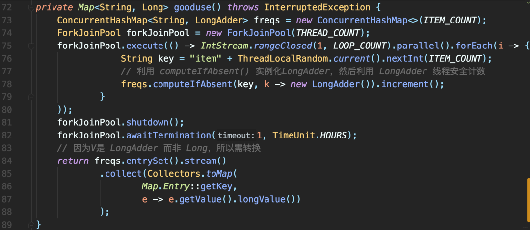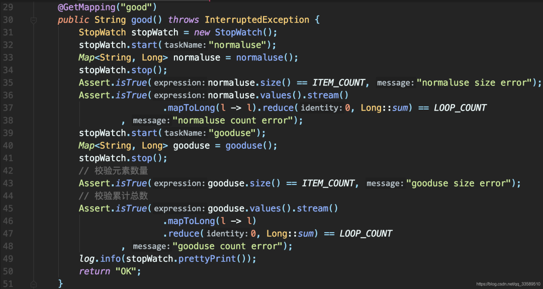 使用StopWatch测试两段代码的性能,最后的断言判断Map中元素的个数及所有V的和是否符合预期来校验代码正确性