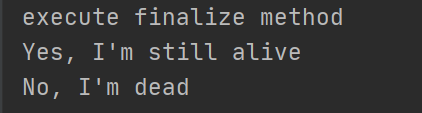 最后打印的结果如上图所示,第一次 gc 的时候,对象被拯救了回来。第二次 gc 的时候,对象就不会再被拯救了,而是直接被垃圾收集器回收。所以 finalize