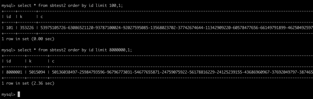 两个语句的内容都非常简单,差别只在 limit 的部分,第一个语句跳过的行数很少,第二个语句跳过的行数很多,结果是两个语句的执行时间差了至少 200 倍。PS:limit 配合 order by 使用是一个好习惯,确保结果数据是稳定的。