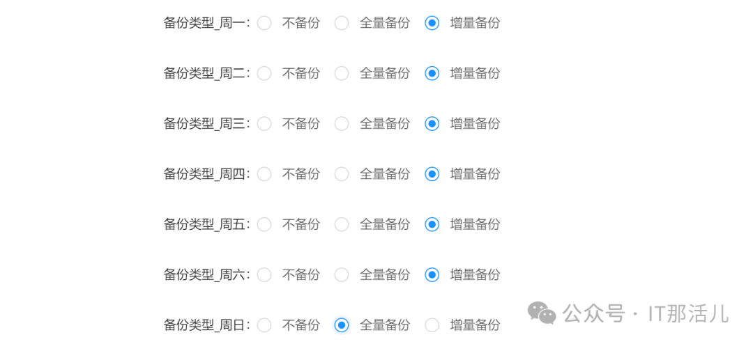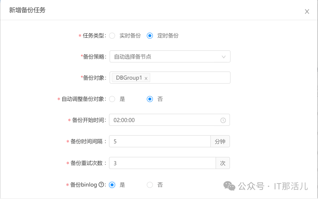 任务类型: 选择定时备份 备份策略: 选择指定机房 机房: 自动选择备节点 备份对象: 选择全部分片 自动调整备份对象:否 备份开始时间: 比如2:00:00, 备份时间间隔: 5分钟 备份重试次数: 3次 备份binlog: 是 备份类型: 周一到周六增量,周日全量