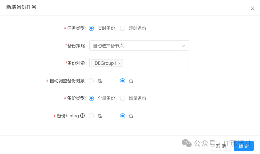 任务类型: 选择实时备份 备份策略: 选择指定机房 机房: 选择高新机房 备份对象: 选择全部分片 自动调整备份对象:选择否 备份类型: 选择全量备份 备份binlog: 选择是
