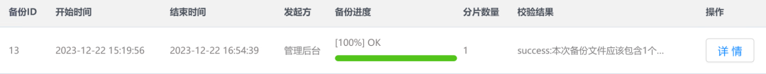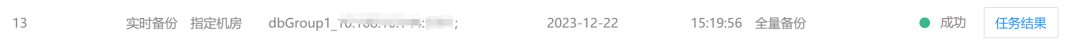1_backup_resultsinfo.20231222151956 备份结果文件,实际的日期时间戳。 DATA_BACKUP目录 存放的数据文件备份。 LOGICAL_BACKUP目录 存放的是逻辑备份文件,包括元数据、binlog以及序列等。