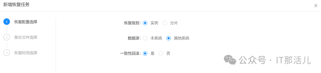 恢复级别: 选择实例 数据源: 选择其他系统 一致性恢复:选择是