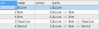 WITH RECURSIVE emp_path AS (SELECT id, name, 1 as level, CAST(name AS CHAR(200)) as pathFROM employeesWHERE manager_id IS NULLUNION ALLSELECT e.id, e.name, ep.level + 1, CONCAT(ep.path, ' -> ', e.name)FROM employees eJOIN emp_path ep ON e.manager_id = ep.id)SELECT * FROM emp_path;