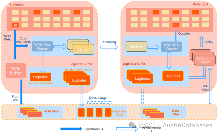从上图可以看到PolarDB for PostgreSQL 的部分在数据同步中,使用了方式是通过内存进行数据同步的方式,通过wal meta queue 从日志中同步化基础数据到Polardb 的从节点。并且将这些信息直接同步到从节点的shared buffer pool 中,同时下面也会将日志同步刷新到磁盘上,如polardb for mysql 一样通过REDO 的日志来进行数据的刷新,通过wal的数据进行从节点的内存的数据的冲刷。