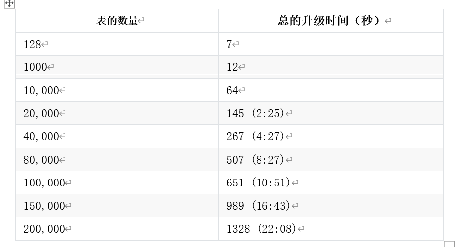 在一个循环中超过 10,000 会导致问题,即使max_locks_per_transaction被调整到最大值,所以根据需要复制这行。您可以测试带有10,000个表的升级,然后带有20,000个表的升级,以生成每万个表额外花费的大致时间指南 - 并从中推断出其他情况。您可以像这样获取总关系数:SELECT count(*) FROM pg_class;