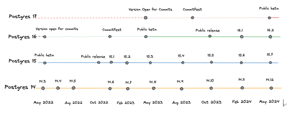 最后一项任务 - 为下一次升级做准备!Postgres每年发布一个新的主要版本。因此,每年或每两年升级一次主要版本是一个很好的解决方案。大约每三个月发布一个新的次要版本。您希望立即安装这些,因为它们只包含关键的错误修复,并且比上面的过程要容易得多!以下是关于Postgres版本14到17发布时间的简要回顾: