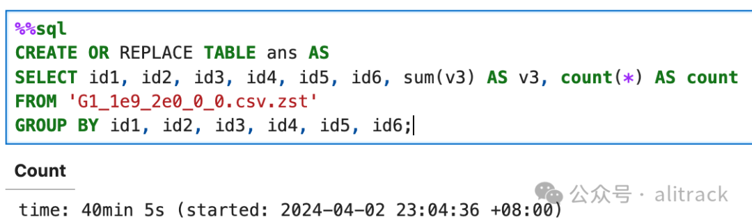 SELECT id1, id2, id3, id4, id5, id6, sum(v3) AS v3, count(*) AS count